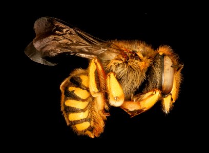 Anthidium manicatum, commonly known as the wool carder bee, is a species of bee native to Europe that was accidentally introduced to North America in the early 1960s. These bees are mid sized, 11-17mm, and are known to be aggressive, attacking and killing native bees throughout Canada and the United States. This species is currently only present in southern Canada, but has been suspected to be travelling further north with every year. These bees are very territorial, and will even chase away larger animals in their territory, often bumping into humans that enter their flower patch. They have an affinity for blue flowers, but are generalists and will get nectar from any source available. Some have speculated that the wool carder bee prefers exotic nectar and will target invasive plants, aiding in their spread. No conclusive studies have been done to support these claims however, so for the time being these remain skeptical accusations. Wool Carders are active from June to October, making it one of the longest persisting bee species in the late autumn season. Carder bees will use hair like fibers from plants to line their nest cavities, which is how they received their names. These bees are most easily distinguished by the yellow wasp-like bands on the sides of their abdomens and smoother appearance.